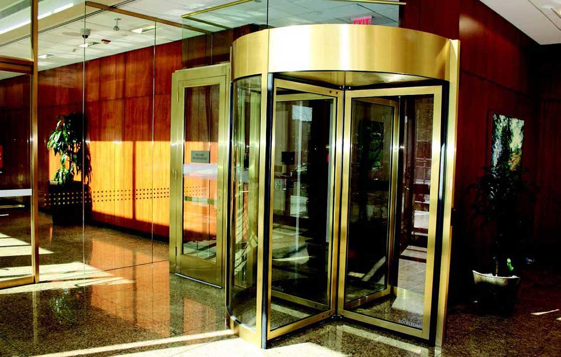 The bank’s offices take up over 20 floors of a heavily-trafficked, high-rise building in a downtown area. A security desk is positioned in the main lobby of the building; however, there is no security coverage to the two banks of elevators. To best track permitted access, the bank wanted to enclose the elevator towers with automatic revolving doors outfitted for electronic access control.